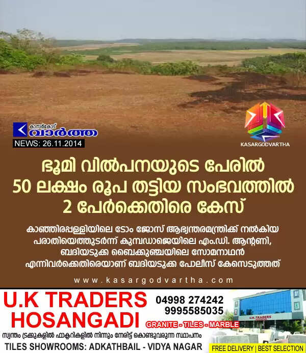 ഭൂമി വില്പനയുടെ പേരില് 50 ലക്ഷം രൂപ തട്ടിയ സംഭവത്തില് 2 പേര്ക്കെതിരെ കേസ്