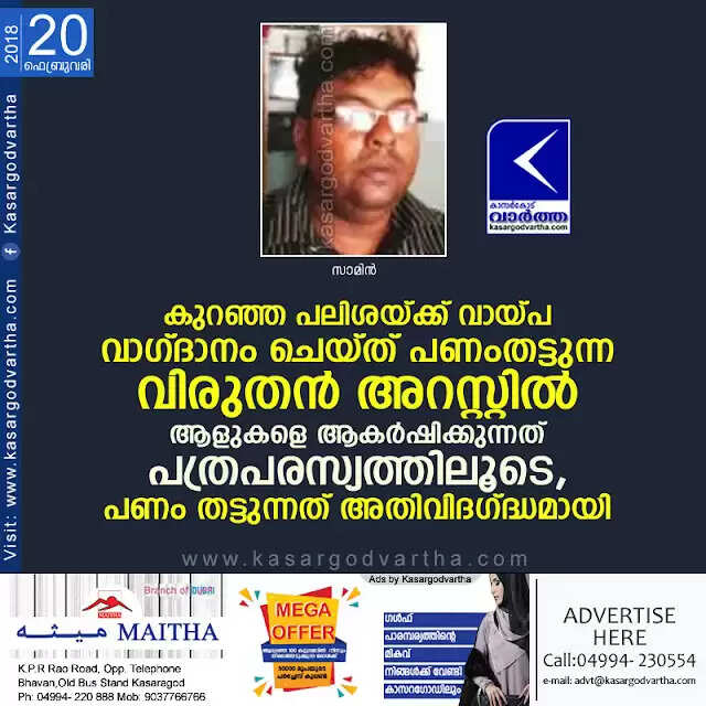 കുറഞ്ഞ പലിശയ്ക്ക് വായ്പ വാഗ്ദാനം ചെയ്ത് പണംതട്ടുന്ന വിരുതന് അറസ്റ്റില്; ആളുകളെ ആകര്ഷിക്കുന്നത് പത്രപരസ്യത്തിലൂടെ, പണം തട്ടുന്നത് അതിവിദഗ്ദ്ധമായി