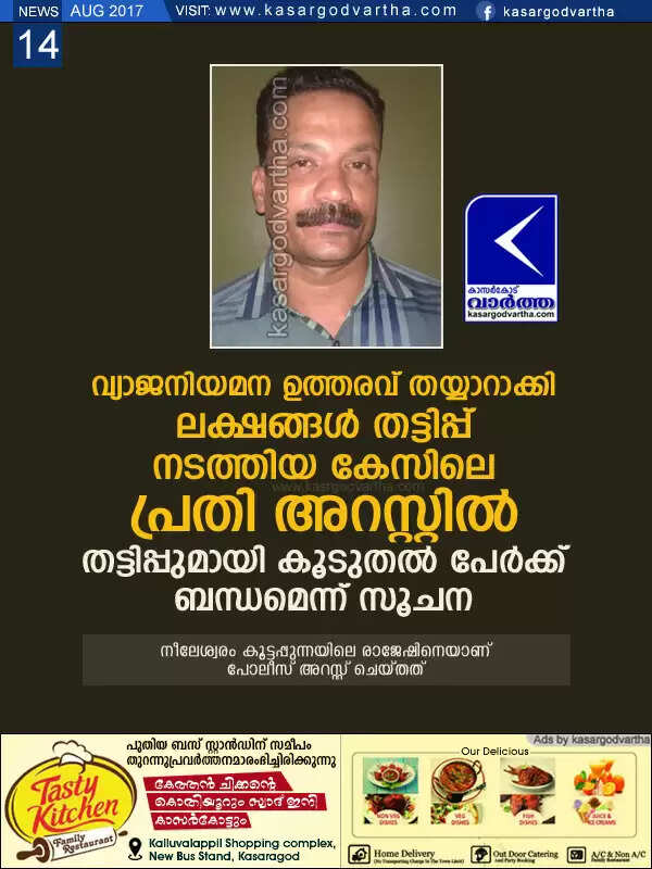 കാഞ്ഞങ്ങാട്:(www.kasargodvartha.com 14.08.2017) വ്യാജ നിയമന ഉത്തരവ് തയ്യാറാക്കിക്കൊടുത്ത് ലക്ഷങ്ങള് തട്ടിയ കേസിലെ പ്രതിയെ പോലീസ് അറസ്റ്റ് ചെയ്തു. നീലേശ്വരം കൂട്ടപ്പുന്നയിലെ രാജേഷിനെയാണ് പോലീസ് അറസ്റ്റ് ചെയ്തത്. നിരവധി പേരില് നിന്നായി ലക്ഷങ്ങളാണ് രാജേഷ് തട്ടിയത്. വെറും എട്ടാംതരം വിദ്യാഭ്യാസം മാത്രമാണ് രാജേഷിനുള്ളത്. ഇത്രയും വലിയ തട്ടിപ്പ് നടത്തിയത് ഇയാള് ഒറ്റയ്ക്കല്ലെന്നാണ് പോലീസ് പറയുന്നത്.