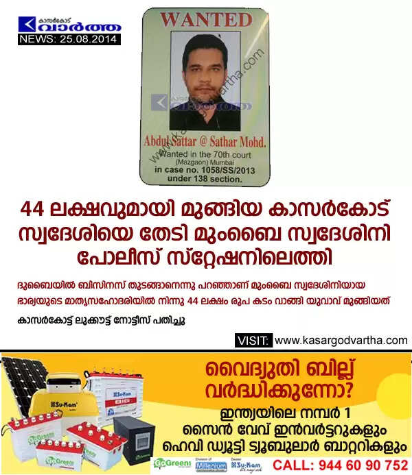 കാസര്കോട്: (www.kasargodvartha.com 25.08.2014) ദുബൈയില് ബിസിനസ് തുടങ്ങാനെന്നു പറഞ്ഞ് മുംബൈ സ്വദേശിനിയായ ഭാര്യയുടെ മാതൃസഹോദരിയില് നിന്നു 44 ലക്ഷം രൂപ കടം വാങ്ങി മുങ്ങിയ തളങ്കര സ്വദേശിയ്ക്കു വേണ്ടി കാസര്കോട്ട് തിരച്ചില്. തളങ്കര വെസ്്റ്റ് കൊളത്തുങ്കര ഹൗസിലെ അബ്ദുല് സത്താര് എന്ന സത്താര് മുഹമ്മദിനു വേണ്ടിയാണ് തിരച്ചില് നടക്കുന്നത്.