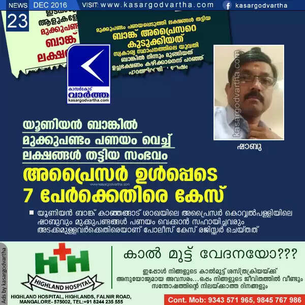 തട്ടിപ്പുമായി ബന്ധപ്പെട്ട് ബാങ്ക് മാനേജര്‍ നേരത്തെ പോലീസില്‍ പരാതി നല്‍കിയിരുന്നെങ്കിലും കേസെടുത്തിരുന്നില്ല. വിശദമായ അന്വേഷണത്തില്‍ തട്ടിപ്പ് ബോധ്യമായതോടെ വ്യാഴാഴ്ച വൈകുന്നേരത്തോടെ പോലീസ് കേസ് രജിസ്റ്റര്‍ ചെയ്യുകയായിരുന്നു. അഞ്ചു വര്‍ഷമായി യൂണിയന്‍ ബാങ്ക് കാഞ്ഞങ്ങാട് ശാഖയില്‍ അപ്രൈസറായി ജോലി ചെയ്ത് വരികയായിരുന്ന ഷാബു ബാങ്കില്‍ എത്തുന്ന ഇടപാടുകാരുമായി സൗഹൃദം നടിച്ച്  മുക്കുപണ്ടം പണയപ്പെടുത്തുകയും ലക്ഷങ്ങള്‍ തട്ടുകയും ചെയ്തുവെന്നാണ് കേസ്.