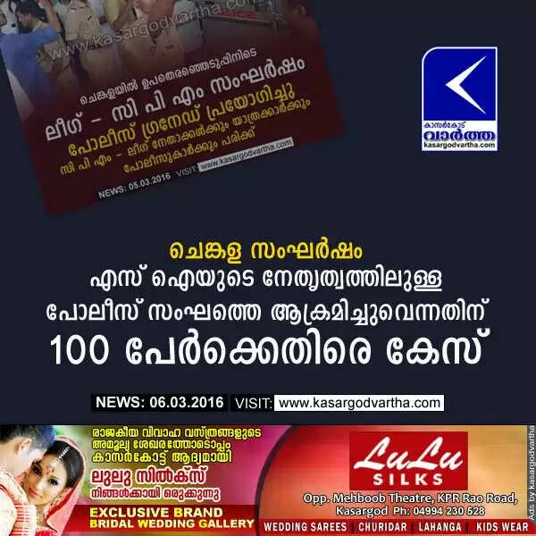 ചെങ്കള സംഘര്ഷം: എസ് ഐയുടെ നേതൃത്വത്തിലുള്ള പോലീസ് സംഘത്തെ ആക്രമിച്ചുവെന്നതിന് 100 പേര്ക്കെതിരെ കേസ്