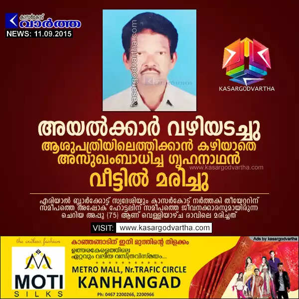 കാസര്‍കോട്: (www.kasargodvartha.com 11/09/2015) അയല്‍ക്കാര്‍ വഴിയടച്ചതോടെ അസുഖംബാധിച്ച ഗൃഹനാഥനെ ആശുപത്രിയില്‍ കൊണ്ടുപോകാന്‍ വീട്ടുകാര്‍ക്ക് കഴിഞ്ഞില്ല. ഇതേതുടര്‍ന്ന് ഗൃഹനാഥന്‍ വീട്ടില്‍വെച്ചുതന്നെ മരിച്ചു. എരിയാല്‍ ബ്ലാര്‍ക്കോട് സ്വദേശിയും കാസര്‍കോട് നര്‍ത്തകി തീയേറ്ററിന് സമീപത്തെ അശോക് ഹോട്ടലിലെ ജീവനക്കാരനുമായിരുന്ന ചെറിയ അപ്പു (75) ആണ് മരിച്ചത്.