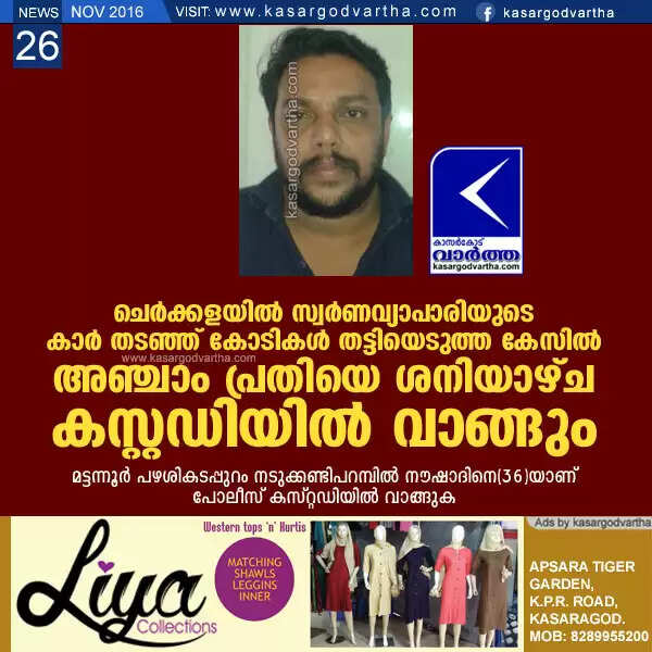 ചെര്ക്കളയില് സ്വര്ണവ്യാപാരിയുടെ കാര് തടഞ്ഞ് കോടികള് തട്ടിയെടുത്ത കേസില് അഞ്ചാം പ്രതിയെ ശനിയാഴ്ച കസ്റ്റഡിയില് വാങ്ങും