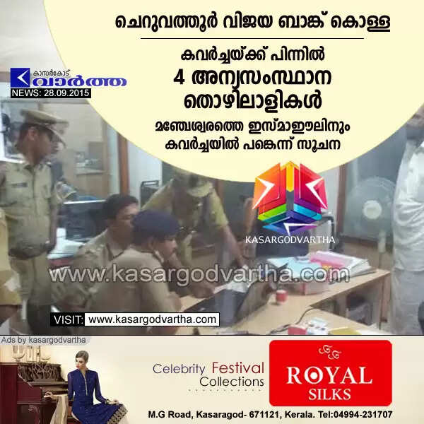 ചെറുവത്തൂര് വിജയ ബാങ്ക് കൊള്ള: കവര്ച്ചയ്ക്ക് പിന്നില് 4 അന്യസംസ്ഥാന തൊഴിലാളികള്, മഞ്ചേശ്വരത്തെ ഇസ്മാഈലിനും കവര്ച്ചയില് പങ്കെന്ന് സൂചന