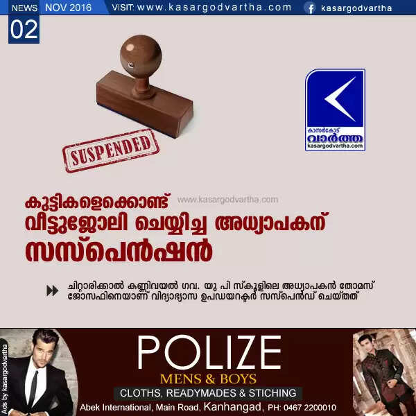 Keywords : Students, School, Teacher, Suspension, Kasaragod, Investigation, Chittarikkal, Child labor case: School teacher suspended.