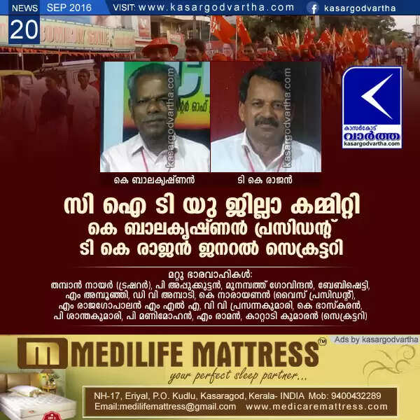 സി ഐ ടി യു ജില്ലാപ്രസിഡന്റായി കെ ബാലകൃഷ്ണനെയും ജനറല് സെക്രട്ടറിയായി ടി കെ രാജനെയും ജില്ലാസമ്മേളനം തെരഞ്ഞെടുത്തു. യു തമ്പാന് നായരാണ് ട്രഷറര്. മറ്റു ഭാരവാഹികള്: പി അപ്പുക്കുട്ടന്, മുനമ്പത്ത് ഗോവിന്ദന്, ബേബിഷെട്ടി, എം അമ്പൂഞ്ഞി, ഡി വി അമ്പാടി, കെ നാരായണന് (വൈസ് പ്രസിഡന്റ്), എം രാജഗോപാലന് എം എല് എ, വി വി പ്രസന്നകുമാരി, കെ ഭാസ്കരന്, പി ശാന്തകുമാരി, പി മണിമോഹന്, എം രാമന്, കാറ്റാടി കുമാരന് (സെക്രട്ടറി). 51 അംഗ ജില്ലാകമ്മിറ്റിയെയും 264 അംഗ ജനറല് കൗണ്സിലിനെയും തെരഞ്ഞെടുത്തു.