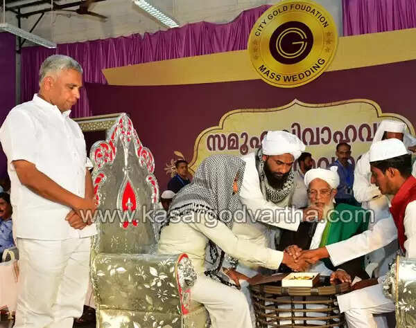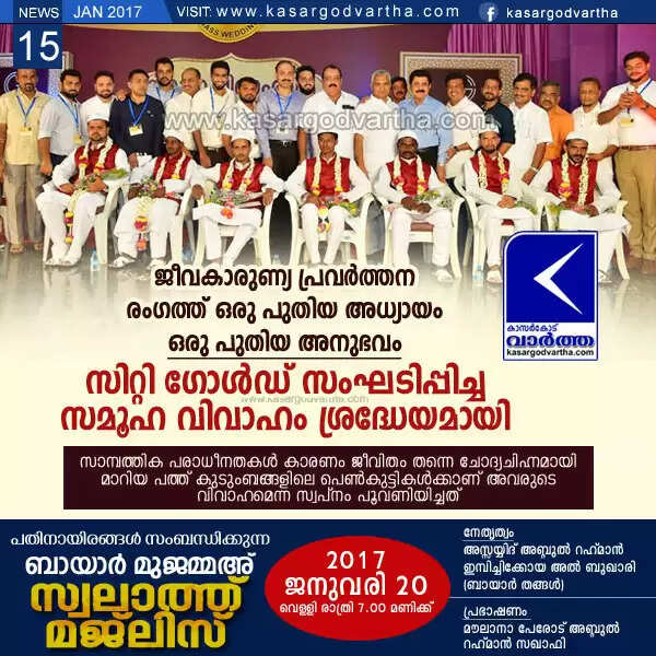 കാസര്കോട് സംയുക്ത ജമാഅത്ത് ഖാസി കെ. ആലികുട്ടി മുസ്ലിയാരുടെ കാര്മികത്വത്തില് മാലിക് ദീനാര് ജുമാ മസ്ജിദിലെ ഖത്തീബ് അബ്ദുല് മജീദ് ബാഖവിയുടെ പ്രാര്ത്ഥനയോടെ നടത്തപ്പെട്ട വിവാഹ ചടങ്ങില് സിറ്റി ഗോള്ഡ് ഫൗണ്ടേഷന് സ്വര്ണ്ണാഭരണങ്ങളും വിവാഹ വസ്ത്രവും സമ്മാനിച്ചു. ഹൈന്ദവ ആചാര പ്രകാരം നടത്തേണ്ട രണ്ട് വിവാഹങ്ങളുടെ ചടങ്ങ് സായിറാം ഭട്ടിന്റെ നേതൃത്വത്തില് അവരുടെ ക്ഷേത്രത്തില് വെച്ച് നടത്തുന്നതായിരിക്കും. ഇതിനാവശ്യമായ സ്വര്ണാഭരണങ്ങളും വിവാഹ വസ്ത്രങ്ങളും മറ്റും സിറ്റി ഗോള്ഡ് ഫൗണ്ടേഷനു വേണ്ടി പ്രൊഫ. കെ.ആലികുട്ടി മുസ്ലിയാര് സായിറാം ഭട്ടിന് കൈമാറി.