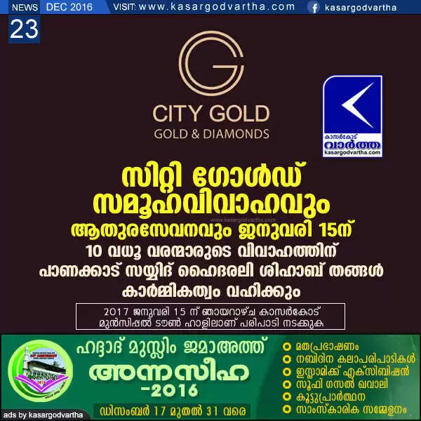 കാസര്‍കോട്: (www.kasargodvartha.com 23/12/2016) രണ്ട് പതിറ്റാണ്ട് കാലത്തോളമായി സാമൂഹ്യ- സേവന- ജീവകാരുണ്യ- പ്രവര്‍ത്തന മേഖലയിലും സ്വര്‍ണ്ണ വ്യാപാര രംഗത്തും മുദ്ര പതിപ്പിച്ച സിറ്റി ഗോള്‍ഡ് ഫാഷന്‍ ജ്വല്ലറി ഒരിക്കല്‍ കൂടി അശരണരും നിരാലംബരുമായ പത്ത് പെണ്‍കുട്ടികള്‍ക്ക് അനുയോജ്യമായ വരന്മാരെ കണ്ടെത്തി സമൂഹ വിവാഹം സംഘടിപ്പിക്കുന്നു. സ്വര്‍ണാഭരണങ്ങളും വിവാഹ വസ്ത്രങ്ങളും വിവാഹ ചെലവുകളും നല്‍കി ആഘോഷപൂര്‍വ്വമായാണ് ഇവരെ പുതു കുടുംബ ജീവിതത്തിലേക്ക് സിറ്റി ഗോള്‍ഡ് കൈ പിടിച്ചുയര്‍ത്തുന്നത്.