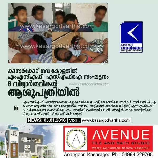 കാസര്കോട് ഗവ കോളജില് എംഎസ്എഫ് - എസ്എഫ്ഐ സംഘട്ടനം; 8 വിദ്യാര്ത്ഥികള് ആശുപത്രിയില്