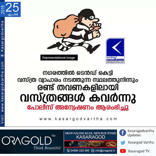 നഗരത്തില് ടെന്ഡ് കെട്ടി വസ്ത്ര വ്യാപാരം നടത്തുന്ന സ്ഥലത്തുനിന്നും രണ്ട് തവണകളിലായി വസ്ത്രങ്ങള് കവര്ന്നു; പോലീസ് അന്വേഷണം ആരംഭിച്ചു