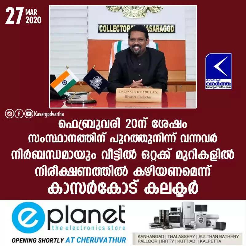 ഫെബ്രുവരി 20ന് ശേഷം സംസ്ഥാനത്തിന് പുറത്തുനിന്ന് വന്നവര് നിര്ബന്ധമായും വീട്ടില് ഒറ്റക്ക് മുറികളില് നിരീക്ഷണത്തില് കഴിയണമെന്ന് കാസര്കോട് കലക്ടര്