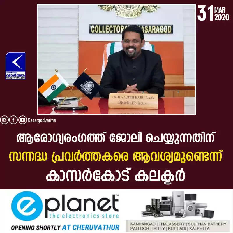 കാസര്‍കോട്: (www.kasargodvartha.com 31.03.2020) കോവിഡ് -19 പ്രതിരോധ പ്രവര്‍ത്തനങ്ങളുടെ ഭാഗമായി ജില്ലയിലെ ആരോഗ്യരംഗത്ത് ജോലി ചെയ്യുന്നതിന് സന്നദ്ധ പ്രവര്‍ത്തകരെ ആവശ്യമുണ്ടെന്ന് ജില്ലാ കളക്ടര്‍ ഡോ  ഡി സജിത് ബാബു  അറിയിച്ചു. ഡോക്ടര്‍മാര്‍, എം ബി ബി എസ് കഴിഞ്ഞിട്ടുള്ള ഹൗസ് സര്‍ജ്ജന്‍മാര്‍, എം ബി ബി എസ് അവസാന വര്‍ഷ വിദ്യാര്‍ത്ഥികള്‍, നേഴ്സിംഗ് കോഴ്സ് പാസായി പ്രവൃത്തി പരിചയമുള്ളവര്‍, നേഴ്സിംഗ് കോഴ്സ് അവസാന വര്‍ഷ വിദ്യാര്‍ത്ഥികള്‍, ഹെല്‍ത്ത് വര്‍ക്കര്‍, സാനിറ്ററി വര്‍ക്കര്‍ കോഴ്സ് കഴിഞ്ഞിട്ടുള്ളവര്‍ എന്നിവരെയാണ് ആവശ്യമുള്ളത്.