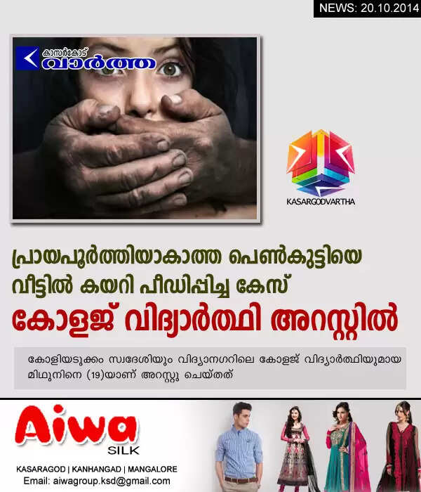Keywords : Vidya Nagar, Kasaragod, Kerala, Accuse, Arrest, Molestation, Koliyadukkam, Mithun, College student arrested for Molestation.