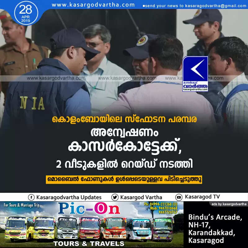 കൊളംബോയിലെ സ്ഫോടന പരമ്പര: അന്വേഷണം കാസര്കോട്ടേക്ക്, 2 വീടുകളില് റെയ്ഡ് നടത്തി, മൊബൈല് ഫോണുകള് ഉള്പ്പെടെയുള്ളവ പിടിച്ചെടുത്തു