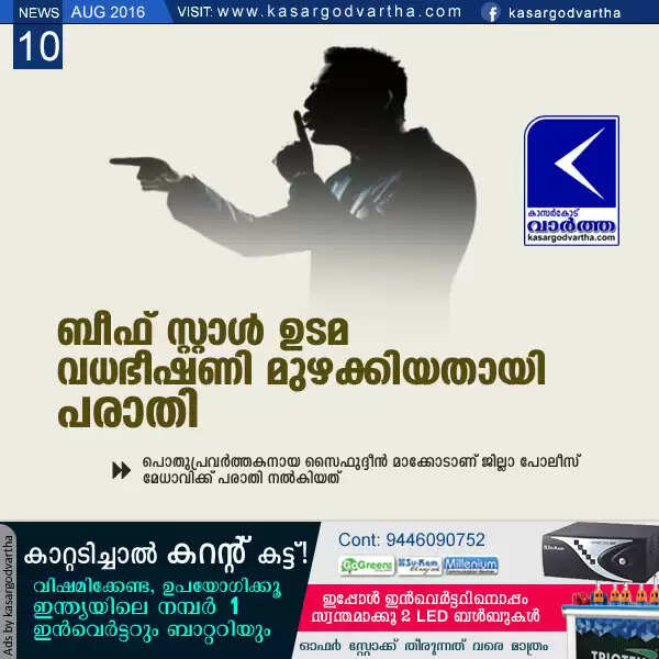 കാസര്‍കോട്: (www.kasargodvartha.com 10.08.2016) മേല്‍പറമ്പിലെ ബീഫ് സ്റ്റാള്‍ ഉടമ വധഭീഷണി മുഴക്കുന്നതായി പരാതി. പൊതുപ്രവര്‍ത്തകനായ സൈഫുദ്ദീന്‍ മാക്കോടാണ് പരാതി നല്‍കിയത്.