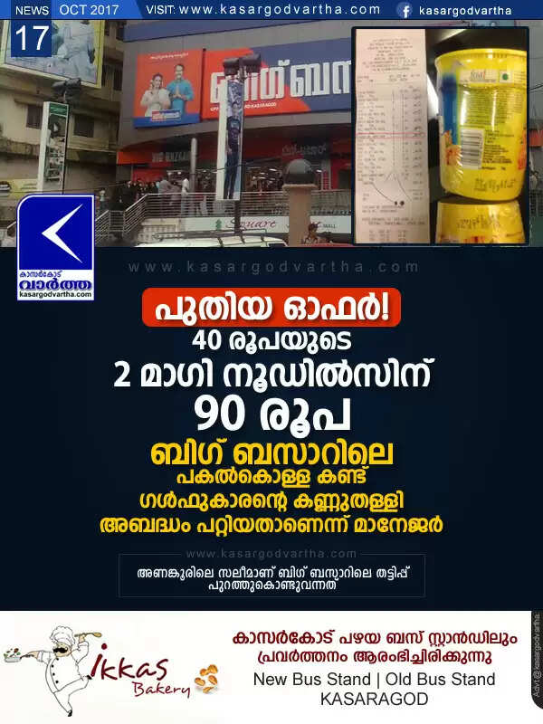 തിങ്കളാഴ്ച ബിഗ് ബസാറില് പര്ച്ചേസ് നടത്തിയ ഗള്ഫുകാരനായ അണങ്കൂരിലെ സലീമിന് 40 രൂപയുടെ രണ്ട് മാഗി നൂഡില്സ് വാങ്ങിയപ്പോള് അതിന്റെ വിലയായി ബില്ലില് രേഖപ്പെടുത്തിയത് 80 രൂപയ്ക്ക് പകരം 90 രൂപയായിരുന്നു. മാഗി നൂഡില്സിന്റെ ബോട്ടിലില് 40 രൂപയാണ് എം ആര് പിയായി രേഖപ്പെടുത്തിയിരുന്നത്. വീട്ടിലെത്തി ബില് പരിശോധിച്ചപ്പോഴാണ് വിലയിലെ അന്തരം ബോധ്യപ്പെട്ടതെന്ന് സലീം കാസര്കോട് വാര്ത്തയോട് പറഞ്ഞു.