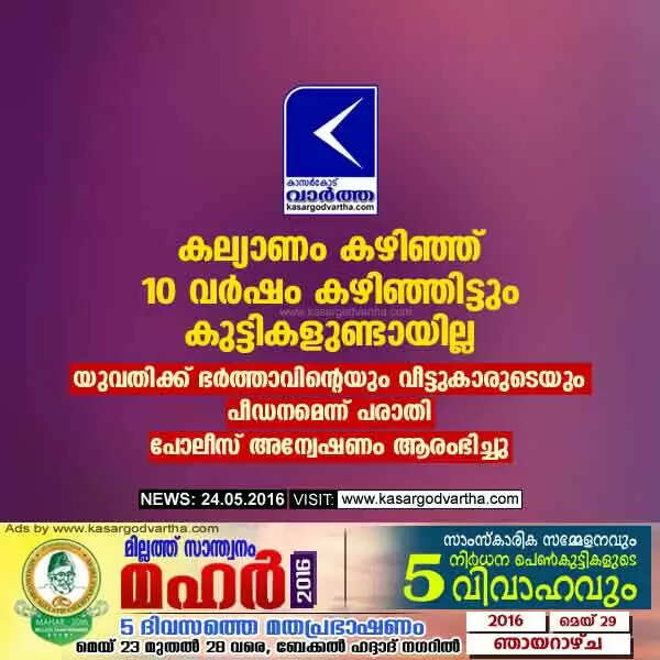 കല്യാണം കഴിഞ്ഞ് 10 വര്ഷം കഴിഞ്ഞിട്ടും കുട്ടികളുണ്ടായില്ല; യുവതിക്ക് ഭര്ത്താവിന്റെയും വീട്ടുകാരുടെയും പീഡനമെന്ന് പരാതി, പോലീസ് അന്വേഷണം ആരംഭിച്ചു