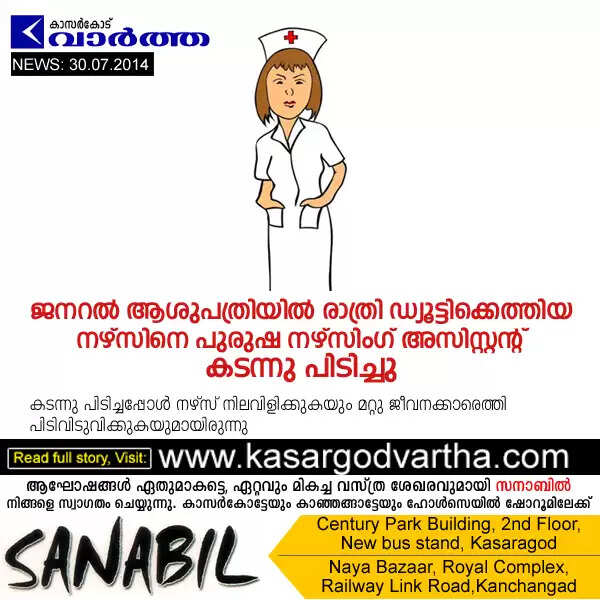 കാസര്‍കോട്: (www.kasargodvartha.com 30.07.2014) ജനറല്‍ ആശുപത്രി ഐ.സി.യു.വില്‍ നൈറ്റ് ഡ്യൂട്ടിയിലുണ്ടായിരുന്ന യുവതിയായ നഴ്‌സിനെ പുരുഷ നഴ്‌സിംഗ് അസിസ്റ്റന്‍ഡ് കടന്നു പിടിച്ചു. ചൊവ്വാഴ്ച രാത്രിയാണ് സംഭവം.