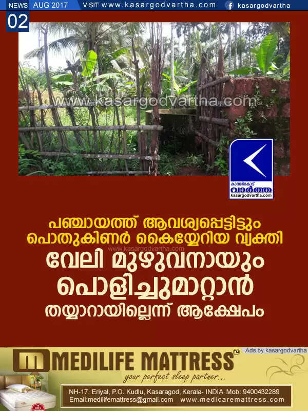 Keyword: Kasaragod, News, Panchayath, Drinking water, Fund,Secretary, Deputy director, Unit secretary, Complaint against person who encroach well.