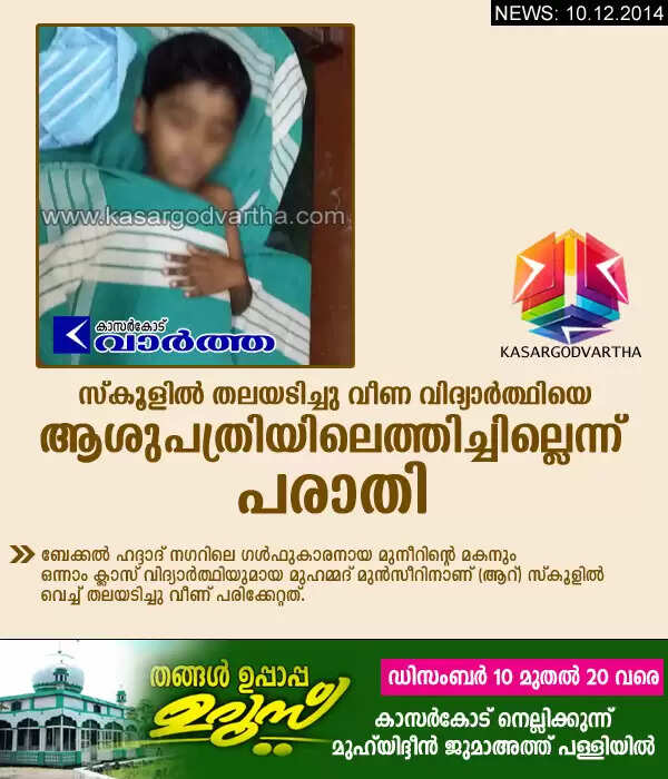 ഉദുമ: (www.kasargodvartha.com 10.12.2014) തലയടിച്ചു വീണ സ്വകാര്യ സ്കൂളിലെ ഒന്നാം ക്ലാസ് വിദ്യാര്ത്ഥിയെ സ്കൂള് അധികൃതര് യഥാസമയം ആശുപത്രിയിലെത്തിച്ചില്ലെന്ന് പരാതി. ബേക്കല് ഹദ്ദാദ് നഗറിലെ ഗള്ഫുകാരനായ മുനീറിന്റെ മകനും ഒന്നാം ക്ലാസ് വിദ്യാര്ത്ഥിയുമായ മുഹമ്മദ് മുന്സീറിനാണ് (ആറ്) സ്കൂളില് വെച്ച് തലയടിച്ചു വീണ് പരിക്കേറ്റത്.