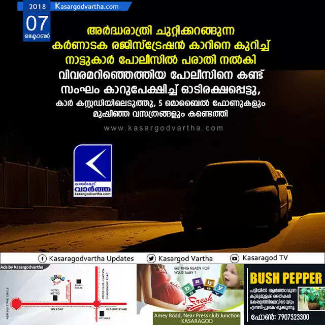 അര്ദ്ധരാത്രി ചുറ്റിക്കറങ്ങുന്ന കര്ണാടക രജിസ്ട്രേഷന് കാറിനെ കുറിച്ച് നാട്ടുകാര് പോലീസില് പരാതി നല്കി; വിവരമറിഞ്ഞെത്തിയ പോലീസിനെ കണ്ട് സംഘം കാറുപേക്ഷിച്ച് ഓടിരക്ഷപ്പെട്ടു, കാര് കസ്റ്റഡിയിലെടുത്തു, 5 മൊബൈല് ഫോണുകളും മുഷിഞ്ഞ വസത്രങ്ങളും കണ്ടെത്തി