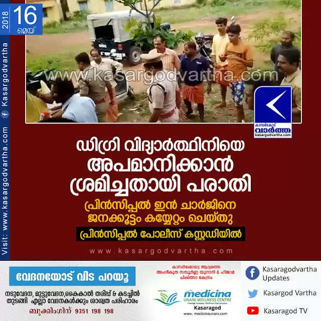 ഡിഗ്രി വിദ്യാര്ത്ഥിനിയെ അപമാനിക്കാന് ശ്രമിച്ചതായി പരാതി; പ്രിന്സിപ്പല് ഇന് ചാര്ജിനെ ജനക്കൂട്ടം കയ്യേറ്റം ചെയ്തു, പ്രിന്സിപ്പല് പോലീസ് കസ്റ്റഡിയില്