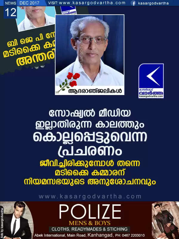 സോഷ്യല് മീഡിയ ഇല്ലാതിരുന്ന കാലത്തും കൊല്ലപ്പെട്ടുവെന്ന പ്രചരണം; ജീവിച്ചിരിക്കുമ്പോള് തന്നെ മടിക്കൈ കമ്മാരന് നിയമസഭയുടെ അനുശോചനവും