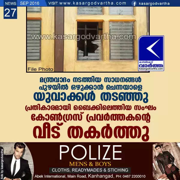 മന്ത്രവാദം നടത്തിയ സാധനങ്ങള് പുഴയില് ഒഴുക്കാന് ചെന്നയാളെ യുവാക്കള് തടഞ്ഞു; പ്രതികാരമായി ബൈക്കിലെത്തിയ സംഘം കോണ്ഗ്രസ് പ്രവര്ത്തകന്റെ വീട് തകര്ത്തു