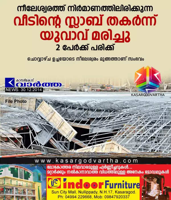 നീലേശ്വരത്ത് നിര്മാണത്തിലിരിക്കുന്ന വീടിന്റെ സ്ലാബ് തകര്ന്ന് യുവാവ് മരിച്ചു; 2 പേര്ക്ക് പരിക്ക്