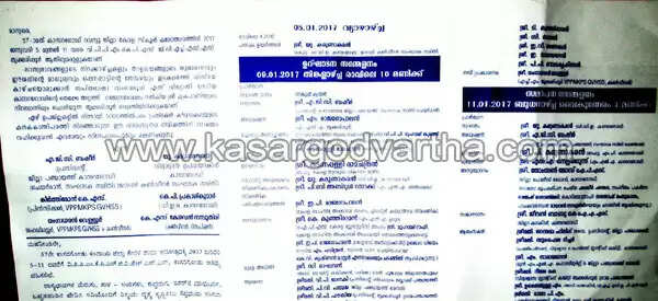 തൃക്കരിപ്പൂര്‍: (www.kasargodvartha.com 08.01.2017) കാസര്‍കോട് ജില്ലാ സ്‌കൂള്‍ കലോത്സവത്തിന്റെ ചടങ്ങുകളില്‍ ജില്ലയുടെ സ്വന്തം മന്ത്രിയെ പങ്കെടുപ്പിച്ചില്ലെന്ന ആക്ഷേപത്തിനിടയില്‍ കലോത്സവ ഉദ്ഘാടന ചടങ്ങിനായി മാറ്റി അടിച്ച നോട്ടീസുകളുടെ എണ്ണം നാലായി. വാര്‍ത്താസമ്മേളനത്തില്‍ വിതരണം ചെയ്ത പ്രിന്റ് കോപ്പി മാറ്റി അടിച്ചത് കൂടാതെ നീല കളറില്‍ രണ്ടാമതും മള്‍ട്ടി കളറില്‍ മൂന്നാമതും ഉദ്ഘാടന മാമാങ്കത്തിനായി നോട്ടീസുകള്‍ തുരുതുരാ ഇറങ്ങി.