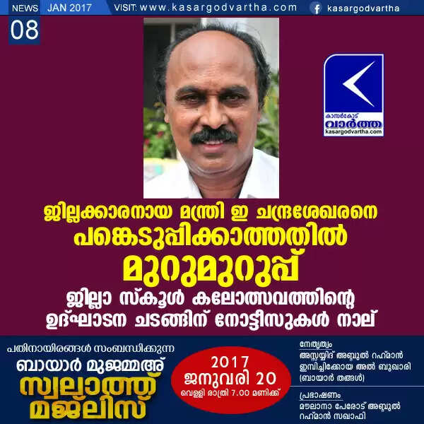 ജില്ലക്കാരനായ മന്ത്രി ഇ ചന്ദ്രശേഖരനെ പങ്കെടുപ്പിക്കാത്തതില്‍ മുറുമുറുപ്പ്; ജില്ലാ സ്‌കൂള്‍ കലോത്സവത്തിന്റെ ഉദ്ഘാടന ചടങ്ങിന് നോട്ടീസുകള്‍ നാല്