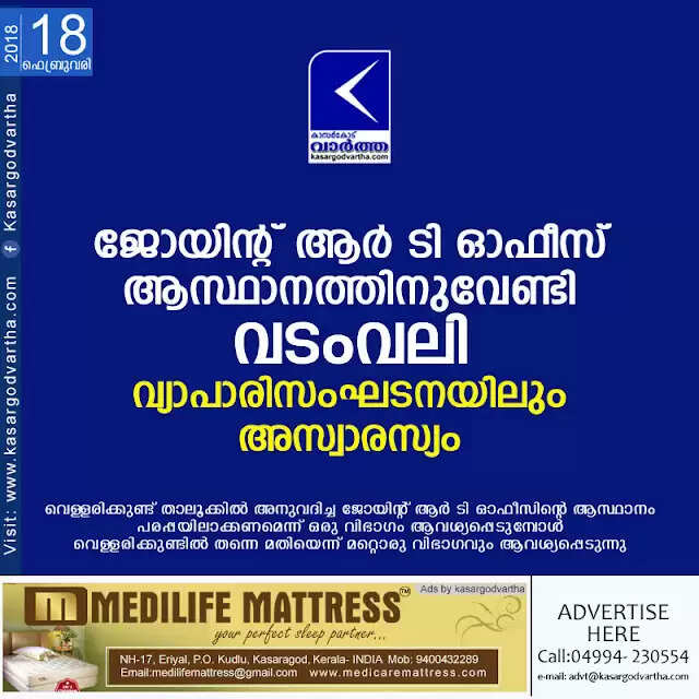 കാഞ്ഞങ്ങാട്;(www.kasargodvartha.com 18/02/2018) ജോയിന്റ് ആര്‍ ടി ഓഫീസ് മലയോരത്ത് എവിടെ സ്ഥാപിക്കണമെന്നതിനെ ചൊല്ലി തര്‍ക്കം. വെള്ളരിക്കുണ്ട് താലൂക്കില്‍ അനുവദിച്ച ജോയിന്റ് ആര്‍.ടി. ഓഫീസിന്റെ ആസ്ഥാനം പരപ്പയിലാക്കണമെന്നാണ് ഒരുവിഭാഗത്തിന്റെ ആവശ്യം. അതേ സമയം വെള്ളരിക്കുണ്ടില്‍ വേണമെന്ന ആവശ്യത്തില്‍ മറുവിഭാഗവും പിടിമുറുക്കി. എന്തുവന്നാലും ജോയിന്റ് ആര്‍.ടി. ഓഫീസിന്റെ ആസ്ഥാനം പരപ്പയിലാക്കാന്‍ അനുവദിക്കില്ലെന്ന നിലപാടിലാണ് വെള്ളരിക്കുണ്ടിലെ സാമൂഹ്യസാംസ്‌കാരികരാഷ്ട്രീയ നേതാക്കള്‍.