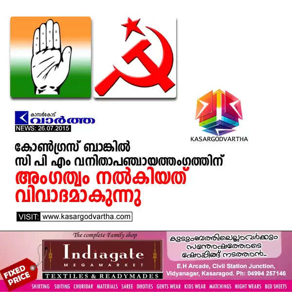 കോണ്ഗ്രസ് ബാങ്കില് സി പി എം വനിതാപഞ്ചായത്തംഗത്തിന് അംഗത്വം നല്കിയത് വിവാദമാകുന്നു