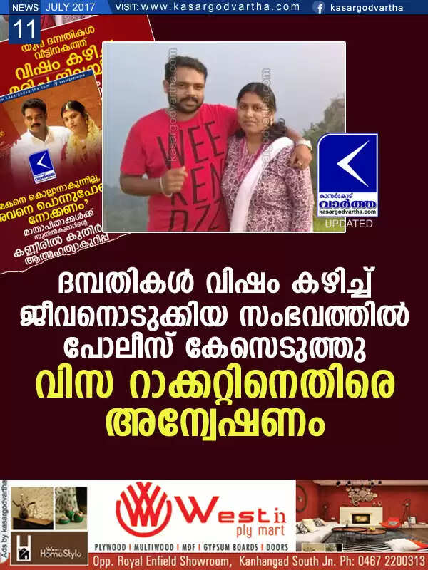 ദമ്പതികള് വിഷം കഴിച്ച് ജീവനൊടുക്കിയ സംഭവത്തില് പോലീസ് കേസെടുത്തു; വിസ റാക്കറ്റിനെതിരെ അന്വേഷണം