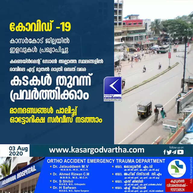 കോവിഡ് -19: കാസര്‍കോട് ജില്ലയില്‍ ഇളവുകള്‍ പ്രഖ്യാപിച്ചു, കണ്ടെയ്ന്‍മെന്റ് സോണ്‍ അല്ലാത്ത സ്ഥലങ്ങളില്‍ രാവിലെ എട്ട് മുതല്‍ രാത്രി ഒമ്പത് വരെ കടകള്‍ തുറന്ന് പ്രവര്‍ത്തിക്കാം, മാനദണ്ഡങ്ങള്‍ പാലിച്ച് ഓട്ടോറിക്ഷ സര്‍വീസ് നടത്താം