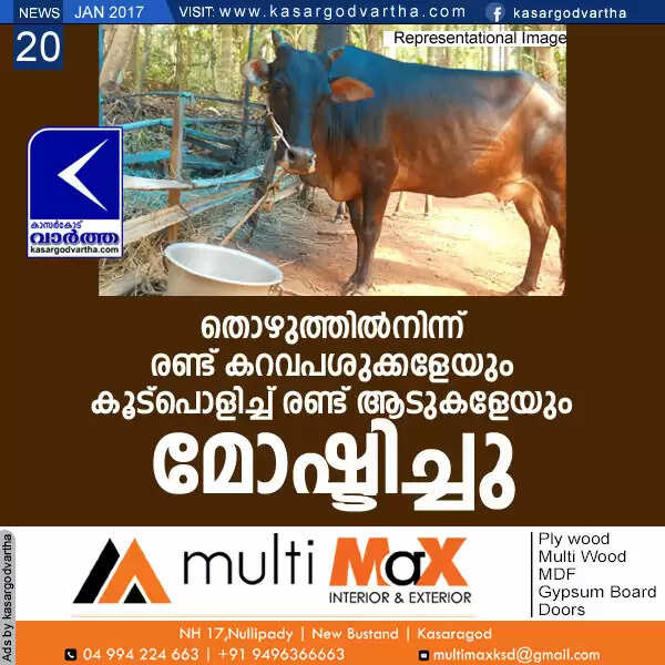 തൊഴുത്തില്നിന്ന് രണ്ട് കറവപശുക്കളേയും കൂട്പൊളിച്ച് രണ്ട് ആടുകളേയും മോഷ്ടിച്ചു