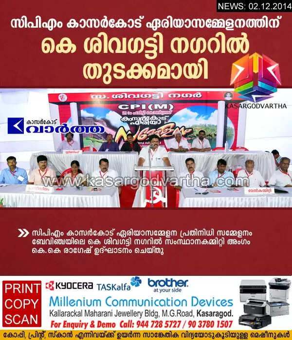 ബേവിഞ്ച:(www.kasargodvartha.com 02.12.2014) സിപിഎം കാസര്കോട് ഏരിയാസമ്മേളനത്തിന് ബേവിഞ്ചയിലെ കെ ശിവഗട്ടി നഗറില് ഉജ്വല തുടക്കം. പ്രതിനിധി സമ്മേളനം സംസ്ഥാനകമ്മിറ്റി അംഗം കെ.കെ രാഗേഷ് ഉദ്ഘാടനം ചെയ്തു.