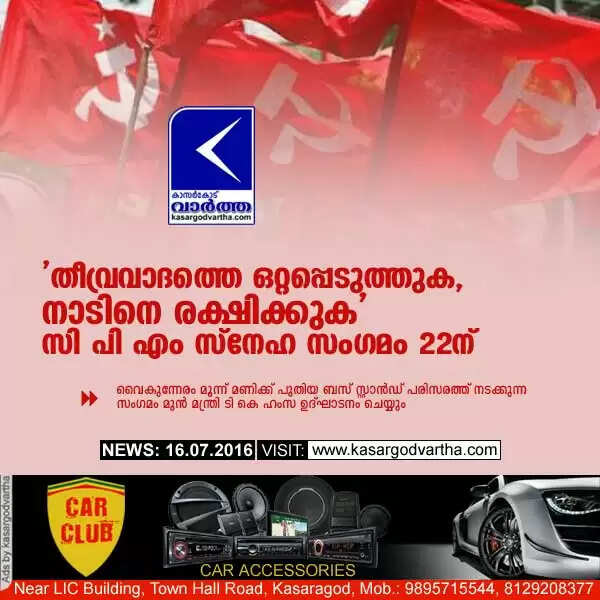 കാസര്‍കോട്: (www.kasargodvartha.com 16/07/2016) 'തീവ്രവാദത്തെ ഒറ്റപ്പെടുത്തുക, നാടിനെ രക്ഷിക്കുക' എന്ന മുദ്രാവാക്യമുയര്‍ത്തി സി പി എം സ്‌നേഹ സംഗമം സംഘടിപ്പിക്കുന്നു. 22ന് വൈകുന്നേരം മൂന്ന് മണിക്ക് പുതിയ ബസ് സ്റ്റാന്‍ഡ് പരിസരത്ത് നടക്കുന്ന സംഗമം മുന്‍ മന്ത്രി ടി കെ ഹംസ ഉദ്ഘാടനം ചെയ്യും.
