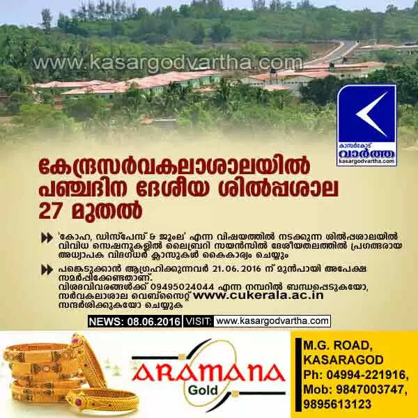 Keywords: Kasaragod, Central University, Shilpashala, Library, Thejaswini Hills Campus, 5 Days, e-Library, Latest Information Technology, Phd Students, Teachers, Participate, Application, University Website.
