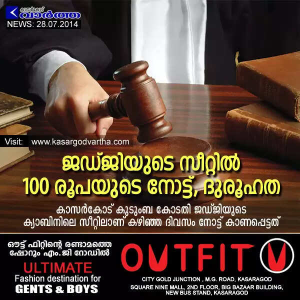 കാസര്കോട്: (www.kasargodvartha.com 28.07.2014) ജഡ്ജിയുടെ ക്യാബിനിലെ സീറ്റില് കാണപ്പെട്ട 100 രൂപ നോട്ട് ദുരൂഹത പരത്തി. കാസര്കോട് കുടുംബ കോടതി ജഡ്ജിയുടെ ക്യാബിനിലെ സീറ്റിലാണ് കഴിഞ്ഞ ദിവസം നോട്ട് കാണപ്പെട്ടത്. പണം എങ്ങനെ ജഡ്ജിയുടെ സീറ്റില് എത്തി എന്നതാണ് സംശയത്തിനിടയാക്കിയത്.