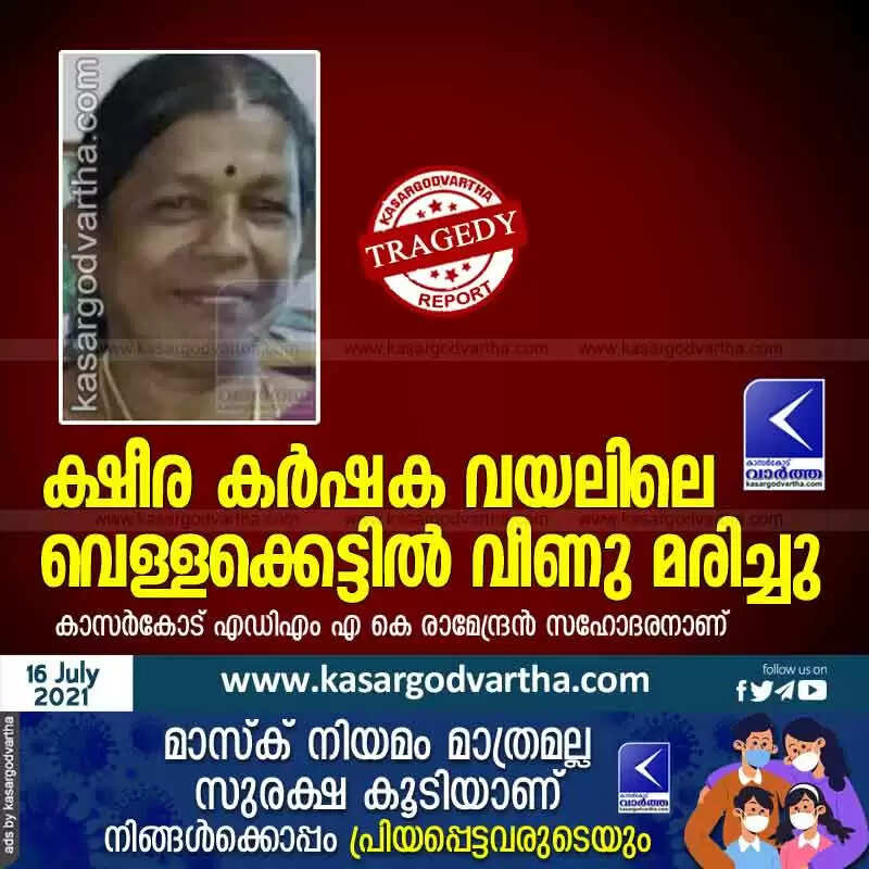 വീടിന് സമീപത്തെ നിടുങ്കണ്ട പാടശേഖരത്തിലായിരുന്നു അപകടം. ഗുരുപൂജ അവാര്ഡ് ജേതാവും മറുത്തുകളി ആചാര്യനുമായിരുന്ന പരേതനായ മടിക്കൈ വി ബാലകൃഷ്ണ പണിക്കറുടെ ഭാര്യയാണ്.