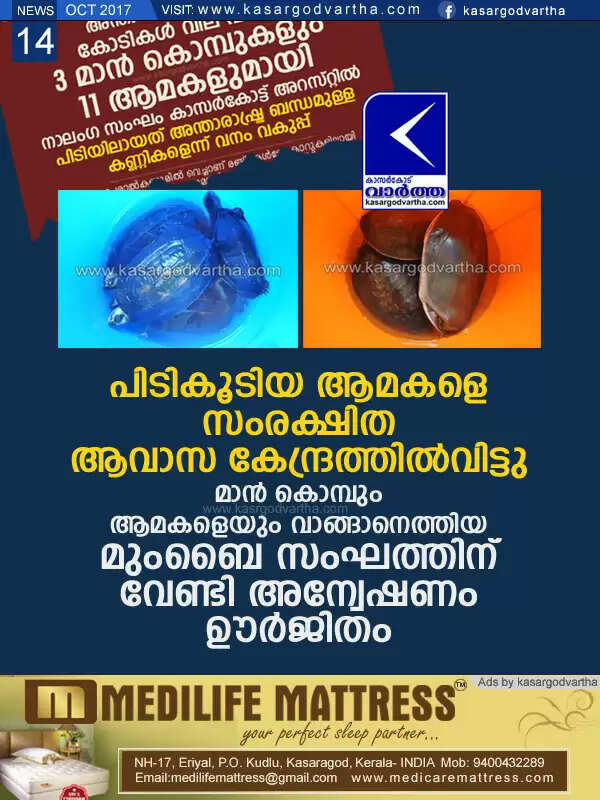 പിടികൂടിയ ആമകളെ സംരക്ഷിത ആവാസ കേന്ദ്രത്തില്വിട്ടു; മാന് കൊമ്പും ആമകളെയും വാങ്ങാനെത്തിയ മുംബൈ സംഘത്തിന് വേണ്ടി അന്വേഷണം ഊര്ജിതം