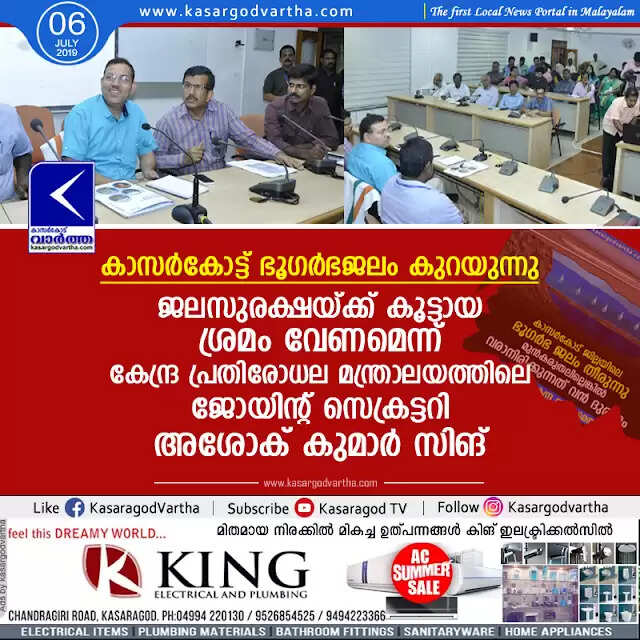 കാസര്കോട്ട് ഭൂഗര്ഭജലം കുറയുന്നു; ജലസുരക്ഷയ്ക്ക് കൂട്ടായ ശ്രമം വേണമെന്ന് കേന്ദ്ര പ്രതിരോധ മന്ത്രാലയത്തിലെ ജോയിന്റ് സെക്രട്ടറി അശോക് കുമാര് സിങ്