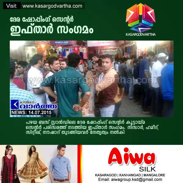 (www.kasargodvartha.com 14/07/2015) പഴയ ബസ് സ്റ്റാന്‍ഡിലെ ദേര ഷോപ്പിംഗ് സെന്റര്‍ കൂട്ടായ്മ സെന്റര്‍ പരിസരത്ത് നടത്തിയ ഇഫ്താര്‍ സംഗമം. നിസാര്‍ മണവാട്ടി, ഹമീദ്, സിദ്ദീഖ്, നൗഷാദ് തുടങ്ങിയവര്‍ നേതൃത്വം നല്‍കി.