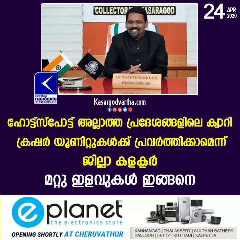 ഹോട്ട്സ്പോട്ട് അല്ലാത്ത പ്രദേശങ്ങളിലെ ക്വാറി, ക്രഷര് യൂണിറ്റുകള്ക്ക് പ്രവര്ത്തിക്കാമെന്ന് ജില്ലാ കളക്ടര്; മറ്റു ഇളവുകള് ഇങ്ങനെ