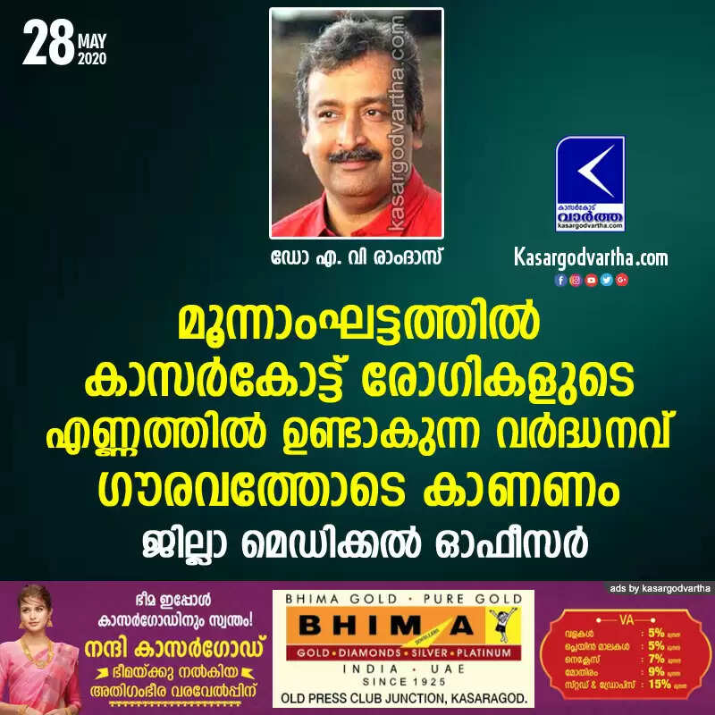 കാസര്‍കോട്: (www.kasargodvartha.com 28.05.2020) കോവിഡ് വ്യാപനത്തിന്റെ  മൂന്നാംഘട്ടത്തില്‍ ജില്ലയില്‍ രോഗികളുടെ എണ്ണത്തില്‍ ഉണ്ടാകുന്ന വര്‍ദ്ധനവ് ഗൗരവത്തോടെ കാണണമെന്ന് ജില്ലാ മെഡിക്കല്‍ ഓഫീസര്‍ ഡോ എ. വി രാംദാസ് അറിയിച്ചു. ജാഗ്രതയോടെ പ്രതിരോധ പ്രവര്‍ത്തനങ്ങള്‍ നടത്തിയില്ലെങ്കില്‍ സമൂഹ വ്യാപന സാധ്യത തള്ളിക്കളയാനാവില്ലെന്ന് അദ്ദേഹം പറഞ്ഞു. വിദേശത്തു നിന്നും ഇതര സംസ്ഥാനങ്ങളില്‍ നിന്നുമുള്ള നമ്മുടെ ജില്ലക്കാരായ ആളുകളുടെ വരവോടുകൂടിയാണ് മൂന്നാംഘട്ട കോവിഡ് രോഗബാധ കൂടുതലായി റിപ്പോര്‍ട്ട് ചെയ്തു തുടങ്ങിയത്.