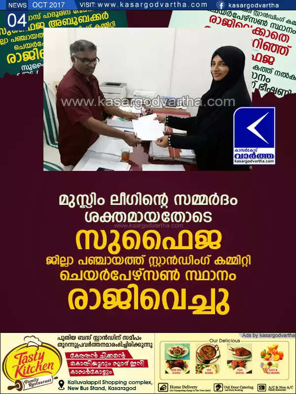 Keywords:  Kasaragod, Kerala, news, District-Panchayath, Muslim-league, District Panchayat Standing committee chairperson Sufaija Aboobacker resigned