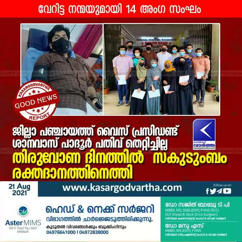 Keywords: Kasaragod, News, District, District-Panchayath, Panchayath, President, Family, Blood donation, Govt-Hospital, District panchayat vice president and family donated blood on onam day.