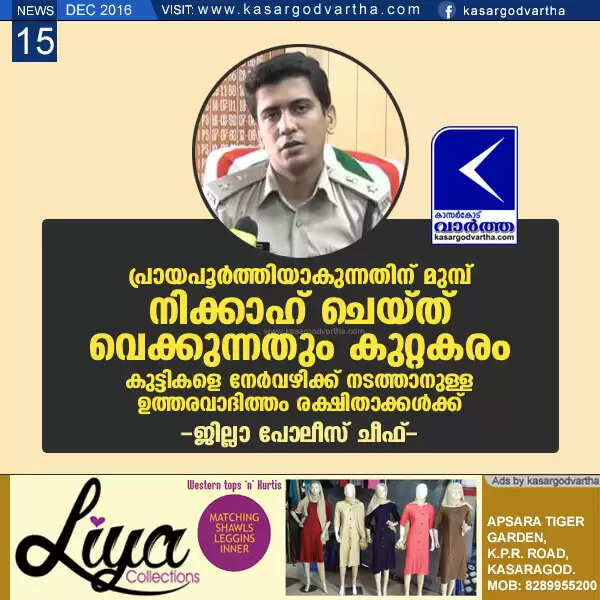Keywords: kasaragod, Kerala, Police, District, Wedding, Child welfare, District police chief against early Nikah.